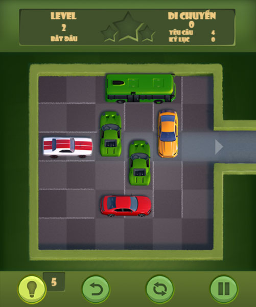 Bãi đậu xe - Bạn có thể thấy game Bãi đậu xe có nhiều nét giống với trò chơi Di chuyển thanh gỗ hoặc tương tự như vậy tại GameVui. Mục tiêu chính trong game Bãi đậu xe là lấy được chiếc xe màu đỏ trắng ra khỏi bãi xe bằng cách di chuyển những chiếc xe khác với số lần ít nhất.