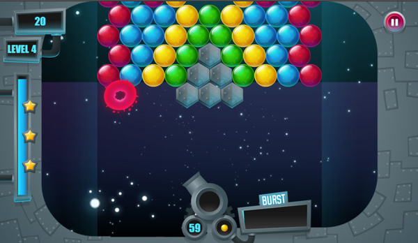 Quy luật của trò Bắn bóng không gian này rất đơn giản, bạn sẽ bắn những quả bóng được cho sẵn vào bản đồ để tạo được các khối cùng màu với nhau và ghi điểm. Khi đầy thanh năng lượng ở dưới góc phải màn hình thì bạn sẽ được dùng hiệu ứng đặc biệt.