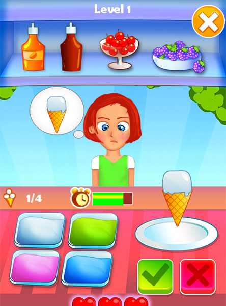 Trong game Bán kem ốc quế, các bạn hãy để ý thật kỹ yêu cầu của các bạn nhỏ nhé, vỏ kem loại gì, nhân kem hương vị gì, các loại hoa quả đi kèm... Và bạn không được phép làm sai quá 3 lần đâu nhé. Game bán hàng, làm bánh này có tính năng lưu điểm, ghi điểm và gửi điểm để người chơi so tài với những đối thủ khác.