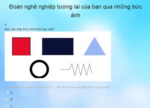 Với mỗi câu hỏi đưa ra, bạn sẽ chọn 1 hoặc nhiều đáp án theo sở thích và xem kết quả cuối cùng.