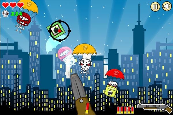 Bắn Zombie nhảy dù - Trò chơi diệt Zombie nhiều người chơi trên GameVui, với mục tiêu chính là những tên xác sống Zombie hung hãn đang nhảy dù từ trên cao xuống và chiếm lấy tòa nhà. Để chơi game Bắn Zombie nhảy dù, các bạn di chuyển chuột trên bản đồ, nhắm vào dù của lũ Zombie và bắn để chúng rơi xuống. Nhớ để ý thu thập vật phẩm, các loại súng khác để tăng sức mạnh để diệt Zombie nhanh hơn.