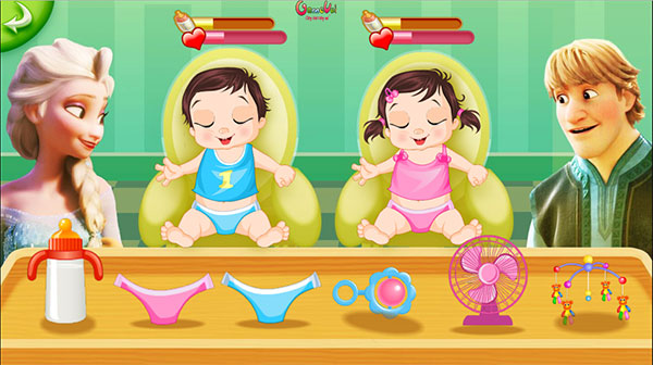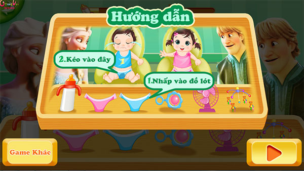 Cặp đôi song sinh là một trong những game trẻ em hay và cực kỳ hấp dẫn trên Game Vui. Trong game bạn hãy giúp Elsa chăm sóc cặp đôi song sinh cực kỳ dễ thương bằng cách kéo những đồ cần thiết sao cho nụ cười luôn nở trên gương mặt hai bé.
