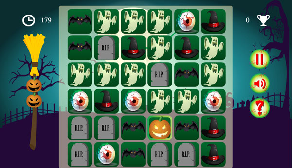 Đêm Halloween - Trò chơi xếp 3 hình giống nhau tương tự như game Xếp kim cương quen thuộc trên GameVui. Trong game Đêm Halloween này, các bạn sẽ dần làm quen với bầu không khí Halloween u ám và đáng sợ, cùng những biểu tượng quen thuộc trong ngày lễ kinh hoàng này, đó là những quả bí ngô, phù thủy, bia mộ, hồn ma... Trong game, bạn sử dụng chuột để chơi.
