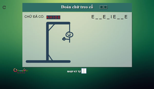 Đoán chữ treo cổ - Game học tập về chủ đề tiếng Anh, giống với những trò chơi Đoán chữ trên GameVui. Trong game Đoán chữ treo cổ sẽ có 2 chế độ là Dễ và Bình thường, người chơi sẽ đoán ô chữ bí mật bằng cách nhập ký tự vào ô, bấm Enter và cứ thế dò ra được dòng chữ có nghĩa cuối cùng sẽ giành chiến thắng. Trò chơi trí tuệ này dựa trên game Người treo cổ - Hangman rất nổi tiếng.