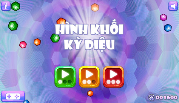 Trong game Hình khối kỳ diệu này, bạn có thể chọn 3 mức: Dễ, vừa và khó tương ứng với 3 màu: xanh, vàng và đỏ.