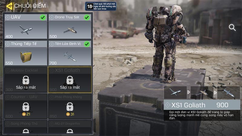 - XS1 Goliath - 900 Chuỗi điểm: nhìn nó khá giống với bộ giáp cổ lỗ sĩ đời đầu của Ironman - Tony Stark có tên là The Mark 1. Và XS1 Goliath trong CODM sở hữu lớp giáp năng lượng khổng lồ cũng như nguồn sát thương đáng nể.
