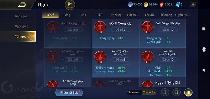 - Ngọc xanh lục: tăng chỉ số tấn công chính của nhân vật như xuyên giáp, xuyên giáp phép...