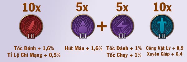 Bảng ngọc full công vật lý xuyên giáp cùng với 10% tốc chạy này rất hợp với các tướng có lượng sát thương cao như Ryoma, Triệu vân, Zephys...