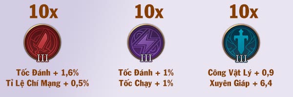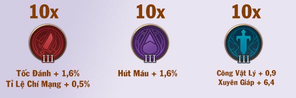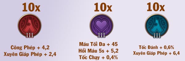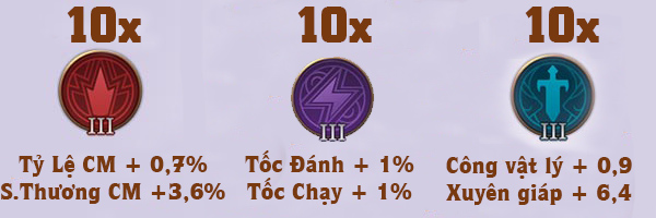 Ngọc đỏ Công phép +4.2 Xuyên giáp phép +2.4 | Ngọc tím Tốc đánh +1% Tốc chạy +1% | Ngọc xanh Tốc đánh +0.6% Xuyên giáp phép +6.4 |