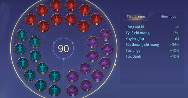 - Ngọc cấp 3: mức cao nhất, tối đa tương ứng với bảng ngọc 90 điểm khi lắp đủ 30 viên.