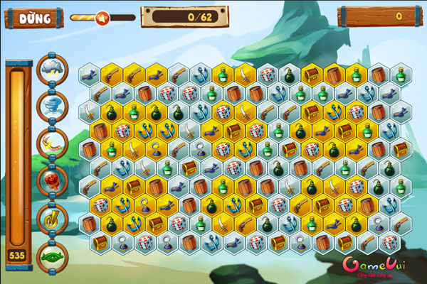 Kho báu bí mật - Dưới đáy đại dương luôn chứa nhiều bí mật, và kho báu khổng lồ của những tên cướp biển là 1 trong những bí mật đó. Trong game Kho báu bí mật này, nhiệm vụ chính của người chơi là giải mã những câu đố ẩn chứa trong các vật phẩm để đến được kho báu đích thực. Chúng được giấu trong những vật dụng, đồ dùng hàng ngày của cướp biển như gươm, xúc xắc, súng, thuốc nổ... Bạn hãy cố gắng sắp xếp những đồ vật đó thành hàng thẳng hoặc ngang và từ 3 vật giống nhau trở lên nhé.