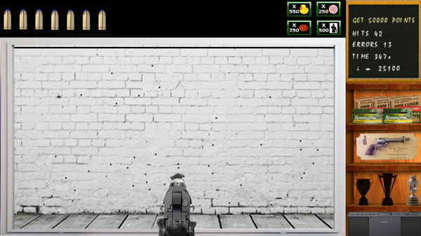 Tập bắn súng lục - Game bắn súng trên GameVui, với mục tiêu là tập luyện khả năng nhanh nhạy và chính xác trong game Bắn súng. Để hoàn thành thử thách, bạn dùng chuột điều khiển khẩu súng lục Pistol và bắn trúng các mục tiêu xuất hiện trên tường, những mục tiêu đó có thể đứng yên hoặc di chuyển, chính vì thế bạn phải thật nhanh tay và chuẩn xác. Để nạp đạn lại, các bạn bắn vào biểu tượng hộp đạn ở phía bên tay phải, nếu bắn trượt quá 20 lần thì sẽ bị xử thua và phải chơi lại.