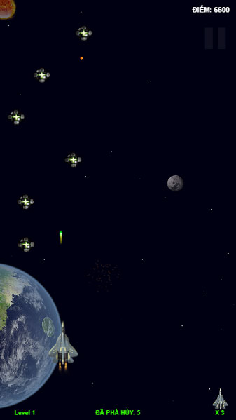 Không chiến - Game thuộc thể loại tàu vũ trụ chiến đấu 24h để chống lại lực lượng quân địch rất đông và nguy hiểm. Trong game Không chiến này, bạn sẽ điều khiển chiếc tàu vũ trụ của quân ta bằng phím mũi tên di chuyển sang trái phải và chiến đấu.