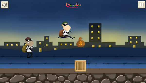 Tên trộm chạy trốn - Game giải trí cũng về cặp đôi siêu trộm, nhưng lần này các bạn sẽ giúp 2 anh chàng trộm chạy và vượt qua quãng đường có nhiều vật cản để trốn thoát. Trong game Tên trộm chạy trốn, bạn sẽ cùng 1 lúc điều khiển cả 2 nhân vật để di chuyển, cách chơi chính là bấm phím mũi tên phải để tên trộm đầu tiên nhảy lên, bấm mũi tên trái để tên tên trộm phía sau nhảy lên. Lưu ý là không được chạm vào bất kỳ chiếc hộp hoặc thùng bom nào trên đường, nếu không sẽ bị thua.