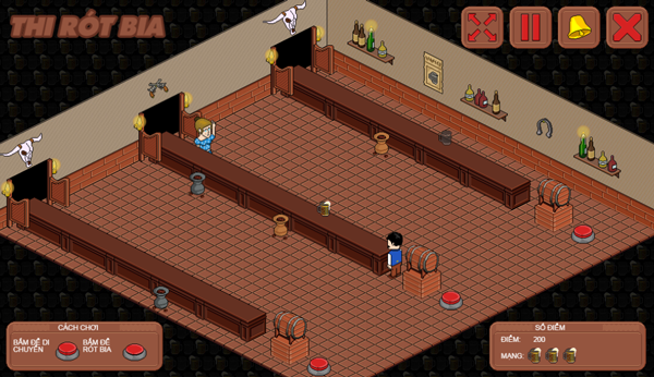 Thi rót bia - Trong trò chơi giải trí, xả stress này, các bạn sẽ đóng vai anh chàng phục vụ quán bia với 3 dãy khách hàng từ cửa ra vào. Nhiệm vụ của người chơi trò Thi rót bia này là bấm chuột để đổ bia vào cốc, đưa cho khách hàng, đồng thời nhận lại những cốc bia trống để chúng không bị rơi xuống đất. Hãy chú ý rót bia đủ cho số khách hàng nhé, không được rót thừa hoặc thiếu vì bạn sẽ chỉ có thể mắc lỗi 3 lần mà thôi.