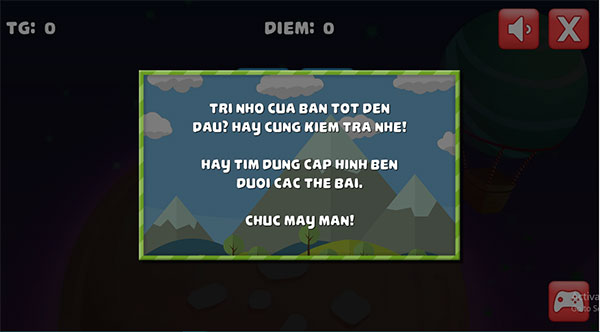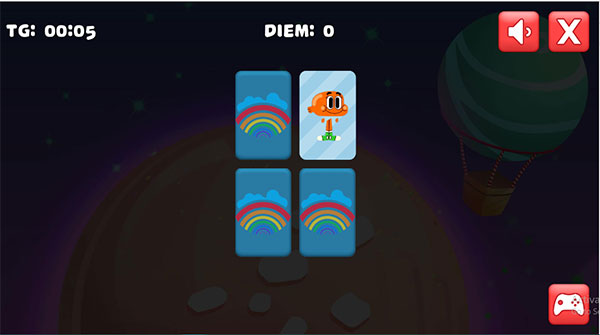 Tìm cặp hình Gumball là một game trí tuệ cực kỳ thú vị trên Game vui dành cho các em nhỏ. Trong Tìm cặp hình Gumball, các em sẽ có cơ hội tái ngộ với các nhân vật trong phim hoạt hình Gumball. Nhiệm vụ của các em là lật các tấm hình giống nhau trong khoảng thời gian càng nhanh càng tốt. Bạn càng lật nhanh và chính xác bao nhiêu thì số điểm ghi được sẽ càng cao.